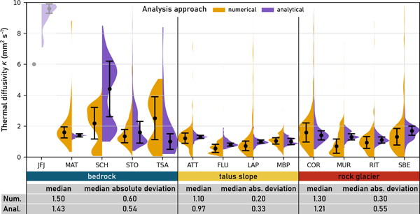 The properties of the permafrost ground depend on its temperature and composition. The authors used temperature data from 29 boreholes in Switzerland to study how heat moves through different types of mountain permafrost landforms, supporting a physically meaningful interpretation of thermal properties in terms of ice content, water saturation, and porosity. Understanding changes is important because they can affect how stable mountain slopes are and how easy it is to build things in mountain areas.